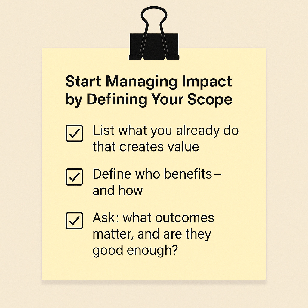 When most people hear “impact management,” they think of paperwork, complex metrics, maybe even a whole new department. Impact should not be separate from business-as-usual, as it risks being peripheral, under-resourced, and performative.